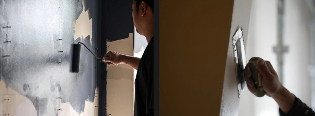 建築特殊塗装とは、従来の建築塗装とは異なる塗料を使用し、意匠性や機能性、素材感の演出に特化した、魅せる塗装方法です。単なる仕切りとしての壁ではなく、空間のイメージを決定付ける要として捉え、壁に多彩な表情を生み出します。様々な製品を使う事で住宅、店舗、オフィス、病院、ホテルなど、目的に合わせ塗料選びを行い実施している本技法を、今回はキャンバスに活用。アーティストそれぞれが持つと共創し、一つの作品となることで、これまでにない、ここだけの一点ものの作品を生み出していきます。