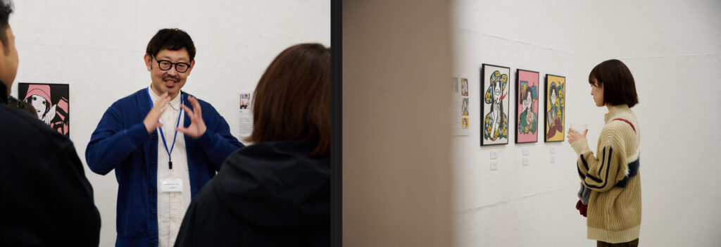 会期中には多数の来場者が訪れ、連日盛況を記録しました。来場者からは「イラストも可愛いけど、背景の特殊な塗料が綺麗だった」「こういった展示会、初めて観ました」といったコメントが寄せられ、建築塗装の技術がアートに応用された新しい表現に驚きと関心が集まりました。